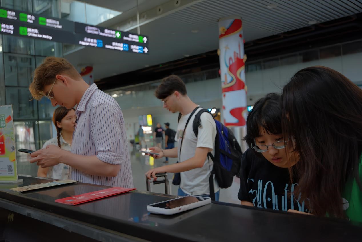 After the students landed at Guangzhou Baiyun International Airport, they quickly set up their WeChat accounts and mobile payment services at a booth in Terminal 2 offering assistance to foreigners.