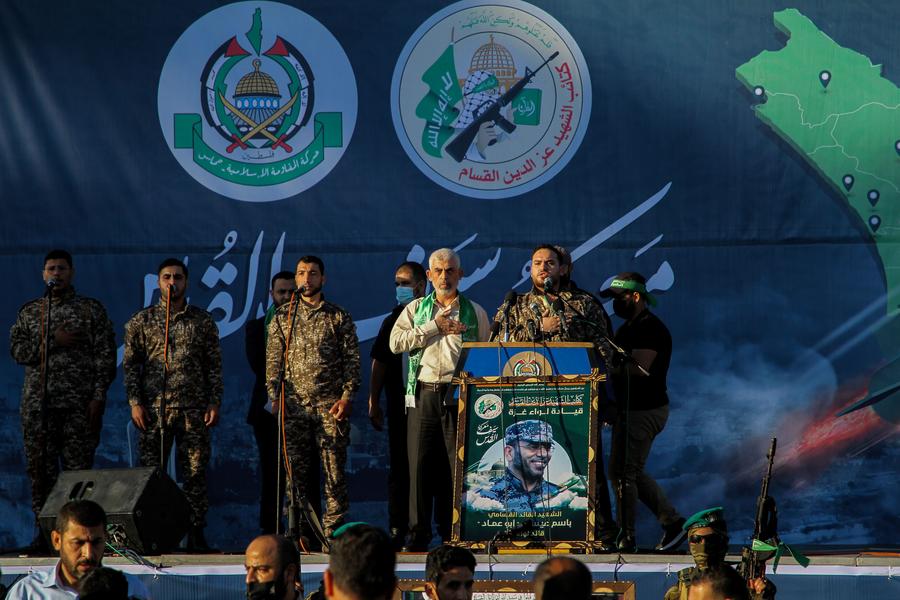 Hamas' leader Yahya Sinwar Home (2R) is seen during a rally by Ezz al-Din al-Qassam brigades (the military wing of Hamas) rally to commemorate the militants who were killed in Israeli bombardment of a tunnel in Gaza City, on May 24, 2021. (Photo by Rizek Abdeljawad/Xinhua)