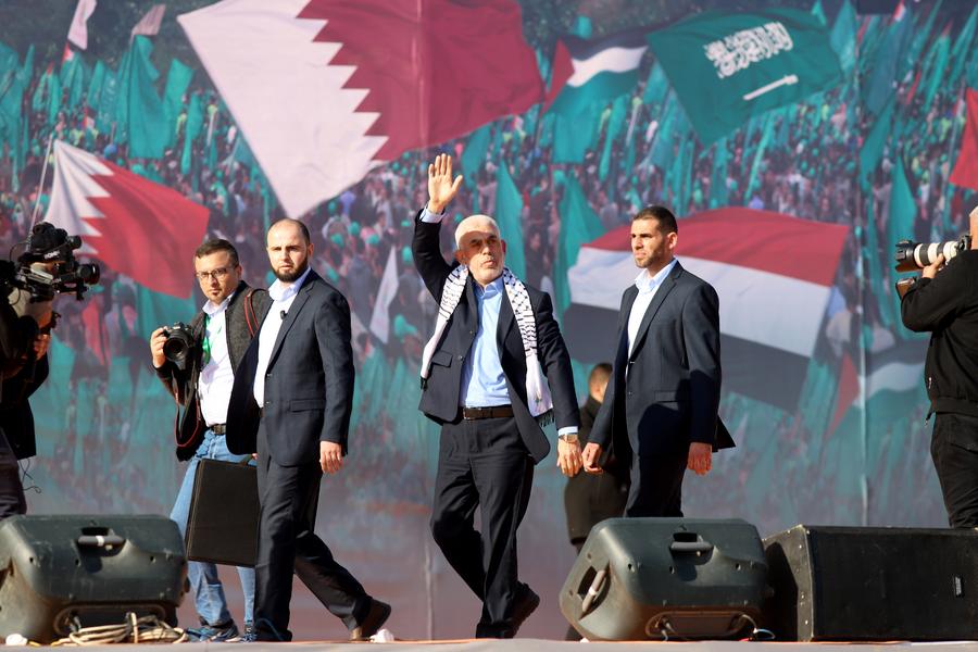 Yahya Sinwar (C), Hamas' leader in the Gaza Strip, waves to supporters at a rally marking the 35th anniversary of the establishment of the movement in Gaza City, on Dec. 14, 2022. (Photo by Rizek Abdeljawad/Xinhua)