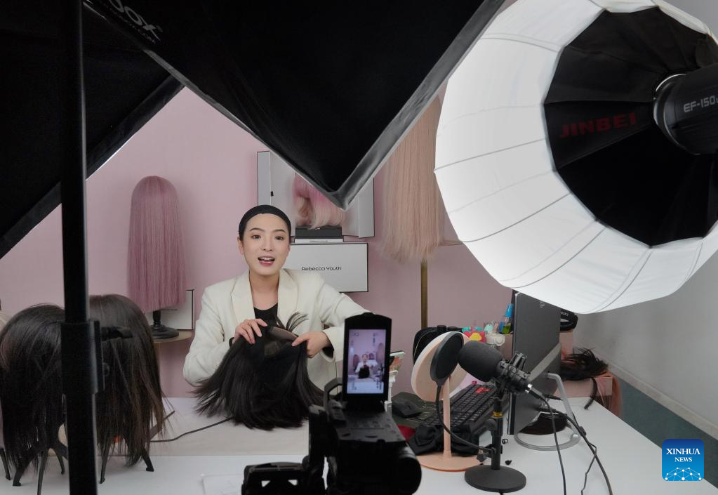 A worker introduces a wig through livestreaming in Xuchang city, central China's Henan Province. (Photo/Xinhua)