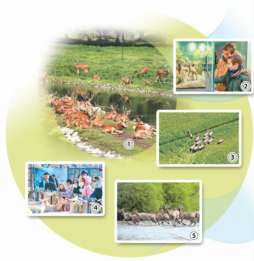 ④: Visitors watch milu deer at the Nanhaizi Milu Park in Daxing district, Beijing. (Photo courtesy of the Nanhaizi Milu Park)
