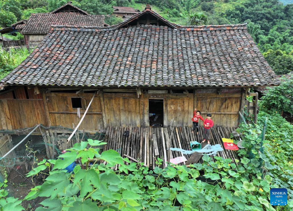 An aerial drone photo taken on July 31, 2024 shows two kids playing on a Ganlan building in Pingliu Village of Longlin County in south China's Guangxi Zhuang Autonomous Region. Pingliu Village, spanning a history of over 200 years, is a Zhuang ethnic-minority hamlet that borders neighboring provinces of Yunnan and Guizhou. Among the well preserved traditions and costumes of the local Zhuang ethnic minority group, the local housing facility, Ganlan building, a stilt wood-structured residential architecture, is most distinctive.