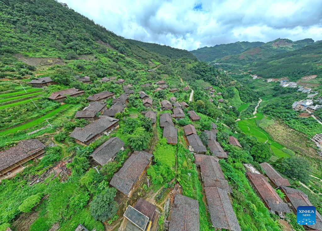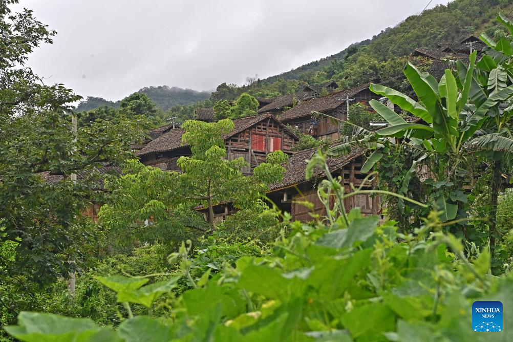 Ganlan buildings are pictured in Pingliu Village of Longlin County in south China's Guangxi Zhuang Autonomous Region, July 31, 2024. Pingliu Village, spanning a history of over 200 years, is a Zhuang ethnic-minority hamlet that borders neighboring provinces of Yunnan and Guizhou. Among the well preserved traditions and costumes of the local Zhuang ethnic minority group, the local housing facility, Ganlan building, a stilt wood-structured residential architecture, is most distinctive.