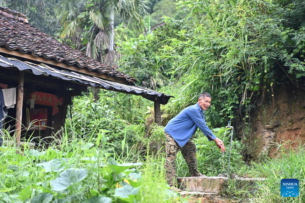 A villager washes hands in front of his wooden Ganlan building in Pingliu Village of Longlin County in south China's Guangxi Zhuang Autonomous Region, July 31, 2024. Pingliu Village, spanning a history of over 200 years, is a Zhuang ethnic-minority hamlet that borders neighboring provinces of Yunnan and Guizhou. Among the well preserved traditions and costumes of the local Zhuang ethnic minority group, the local housing facility, Ganlan building, a stilt wood-structured residential architecture, is most distinctive.