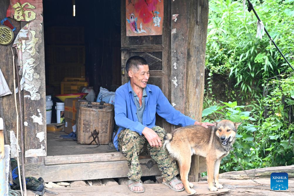 A villager sits on the doorsill of his wooden Ganlan building in Pingliu Village of Longlin County in south China's Guangxi Zhuang Autonomous Region, July 31, 2024. Pingliu Village, spanning a history of over 200 years, is a Zhuang ethnic-minority hamlet that borders neighboring provinces of Yunnan and Guizhou. Among the well preserved traditions and costumes of the local Zhuang ethnic minority group, the local housing facility, Ganlan building, a stilt wood-structured residential architecture, is most distinctive.