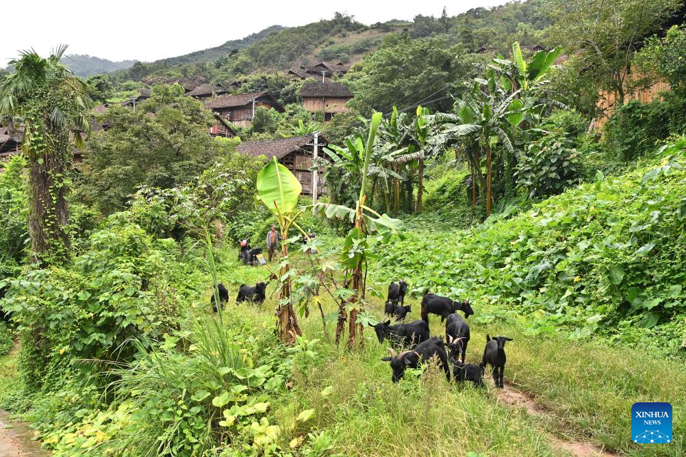 A herd of goats are seen in Pingliu Village of Longlin County in south China's Guangxi Zhuang Autonomous Region, July 31, 2024. Pingliu Village, spanning a history of over 200 years, is a Zhuang ethnic-minority hamlet that borders neighboring provinces of Yunnan and Guizhou. Among the well preserved traditions and costumes of the local Zhuang ethnic minority group, the local housing facility, Ganlan building, a stilt wood-structured residential architecture, is most distinctive.