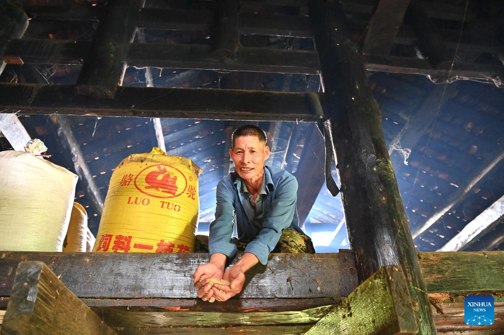 A villager shows rice stored on the top floor of his wooden Ganlan building in Pingliu Village of Longlin County in south China's Guangxi Zhuang Autonomous Region, July 31, 2024. Pingliu Village, spanning a history of over 200 years, is a Zhuang ethnic-minority hamlet that borders neighboring provinces of Yunnan and Guizhou. Among the well preserved traditions and costumes of the local Zhuang ethnic minority group, the local housing facility, Ganlan building, a stilt wood-structured residential architecture, is most distinctive.