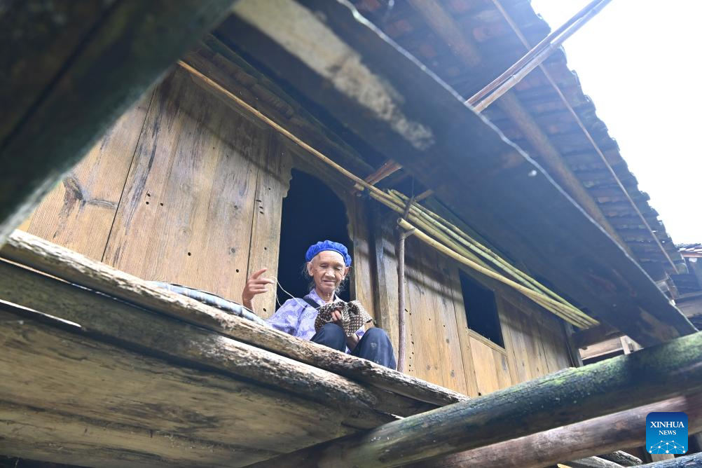 A villager does needlework inside her wooden Ganlan building in Pingliu Village of Longlin County in south China's Guangxi Zhuang Autonomous Region, July 31, 2024. Pingliu Village, spanning a history of over 200 years, is a Zhuang ethnic-minority hamlet that borders neighboring provinces of Yunnan and Guizhou. Among the well preserved traditions and costumes of the local Zhuang ethnic minority group, the local housing facility, Ganlan building, a stilt wood-structured residential architecture, is most distinctive.