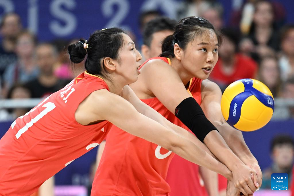 Gong Xiangyu (R) of China saves the ball during the women's quarterfinal match of volleyball between China and Trkiye at the Paris 2024 Olympic Games in Paris, France, Aug. 6, 2024. (Xinhua/Liu Dawei)