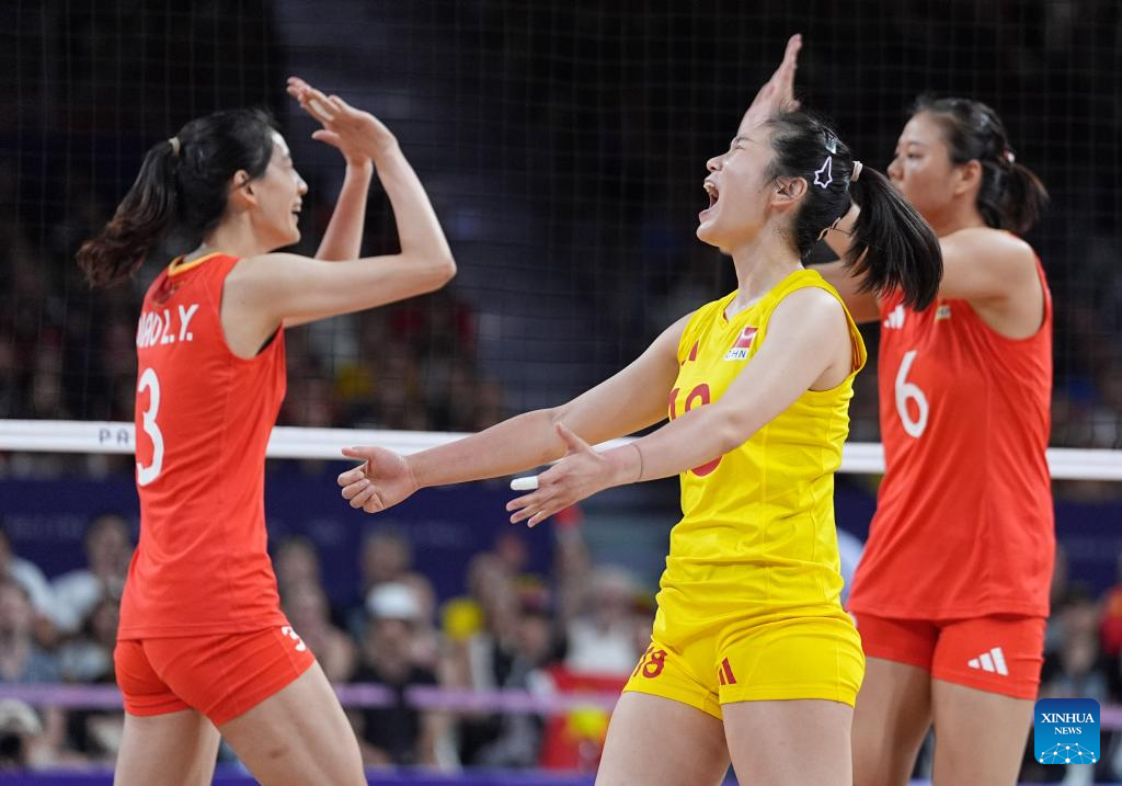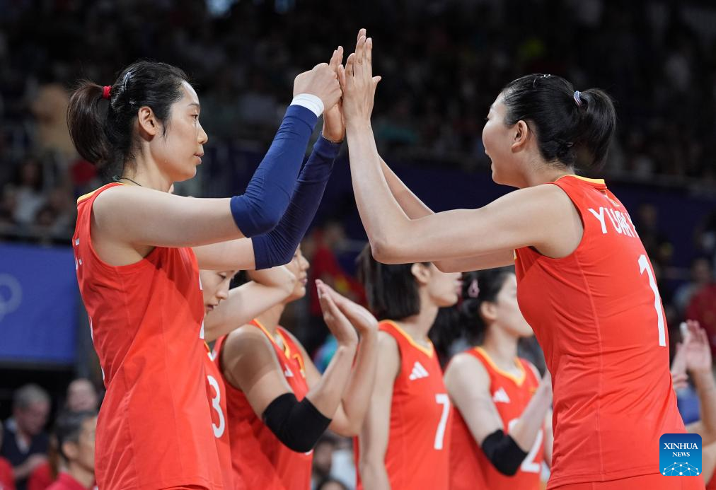 Players of China celebrate after scoring during the women's quarterfinal match of volleyball between China and Trkiye at the Paris 2024 Olympic Games in Paris, France, Aug. 6, 2024. (Xinhua/Ju Huanzong)