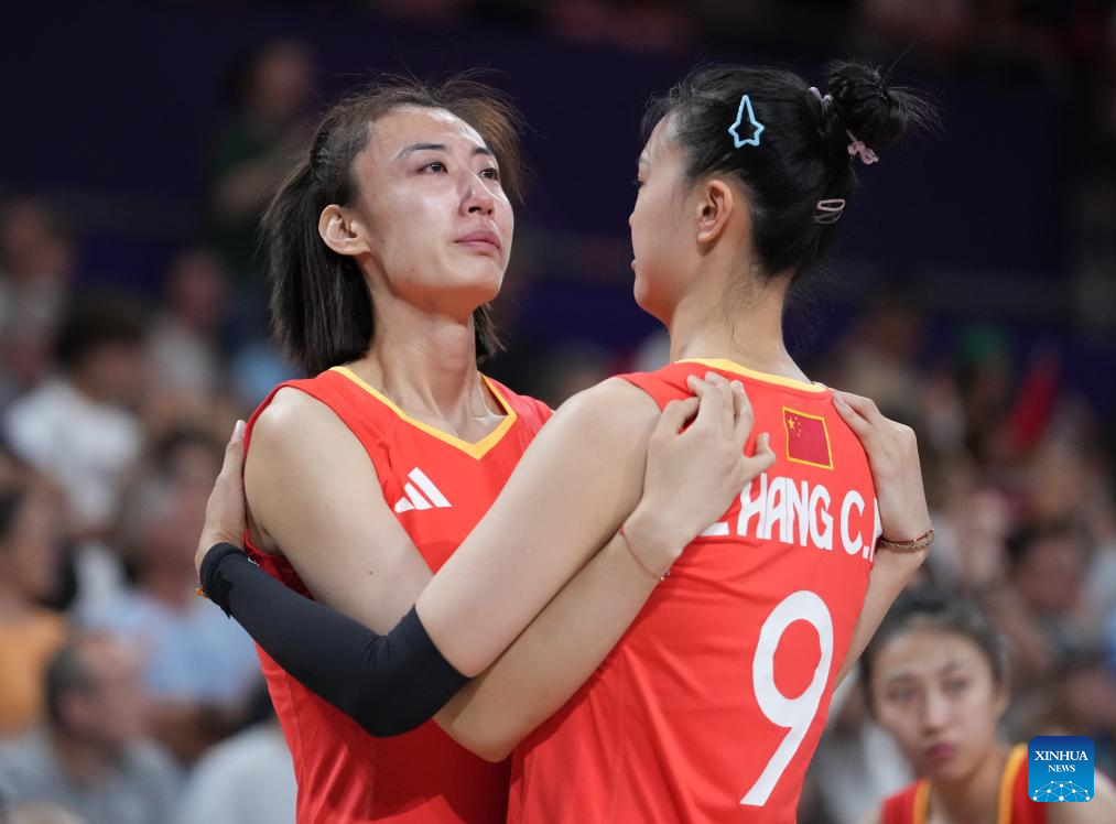 Gong Xiangyu (L) of China reacts after the women's quarterfinal match of volleyball between China and Trkiye at the Paris 2024 Olympic Games in Paris, France, Aug. 6, 2024. (Xinhua/Ju Huanzong)
