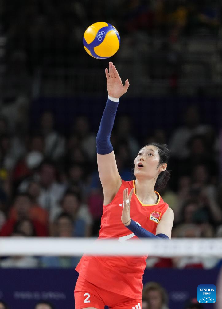 Zhu Ting of China competes during the women's quarterfinal match of volleyball between China and Trkiye at the Paris 2024 Olympic Games in Paris, France, Aug. 6, 2024. (Xinhua/Ju Huanzong)