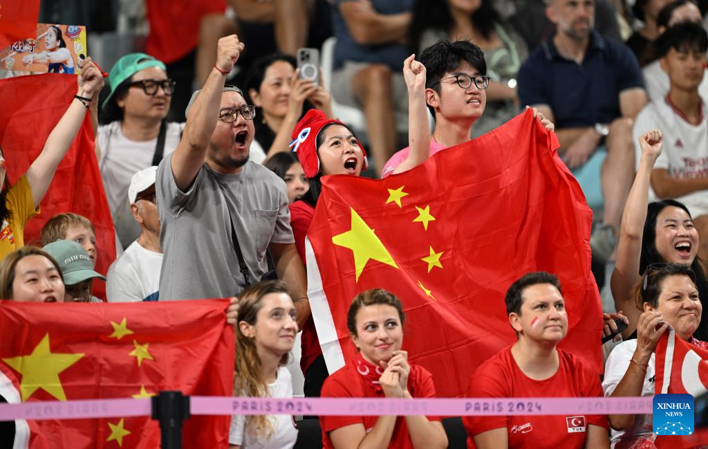 Spectators cheer for team China during the women's quarterfinal match of volleyball between China and Trkiye at the Paris 2024 Olympic Games in Paris, France, Aug. 6, 2024. (Xinhua/Liu Dawei)