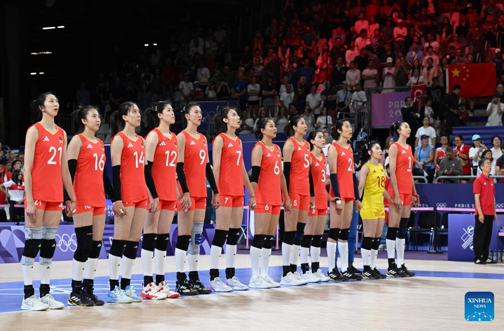 Players of China are seen prior to the women's quarterfinal match of volleyball between China and Trkiye at the Paris 2024 Olympic Games in Paris, France, Aug. 6, 2024. (Xinhua/Liu Dawei)