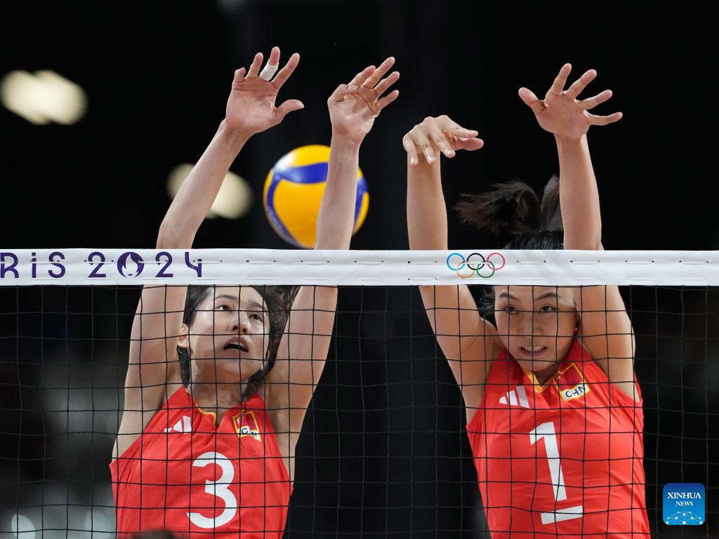 Yuan Xinyue (R) and Diao Linyu of China block during the women's quarterfinal match of volleyball between China and Trkiye at the Paris 2024 Olympic Games in Paris, France, Aug. 6, 2024. (Xinhua/Ju Huanzong)