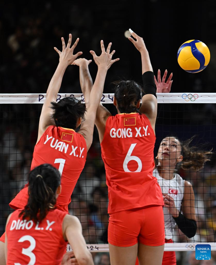 Yuan Xinyue (C top) of China spikes the ball during the women's quarterfinal match of volleyball between China and Trkiye at the Paris 2024 Olympic Games in Paris, France, Aug. 6, 2024. (Xinhua/Liu Dawei)