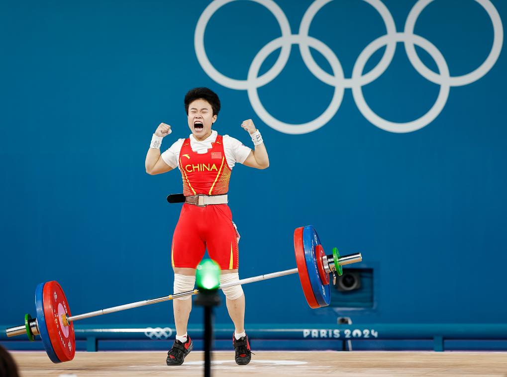 Hou Zhihui of China celebrates after winning the women's 49kg weightlifting at the Paris Olympics on Aug. 7, 2024. (Xinhua/Fei Maohua)