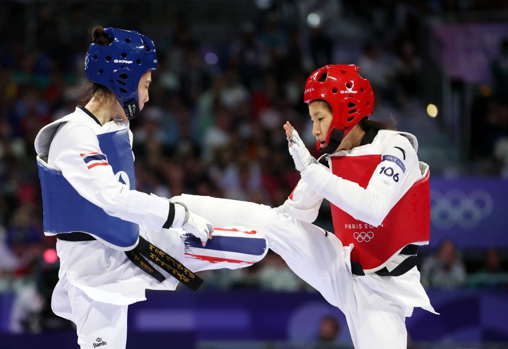 Guo Qing (R) of China reacts during the women's 49kg final of taekwondo against Panipak Wongpattanakit of Thailand at the Paris Olympics on Aug. 7, 2024. (Xinhua/Li Ying)