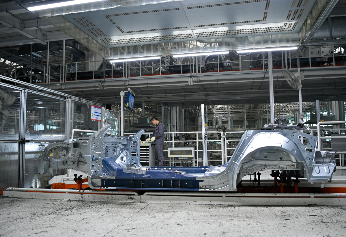 A worker adjusts a fully automated production line in the welding workshop of the Fanrong plant area of the FAW Hongqi Manufacturing Center in Changchun, Jilin province, on Aug 5, 2024. [Photo/Xinhua]