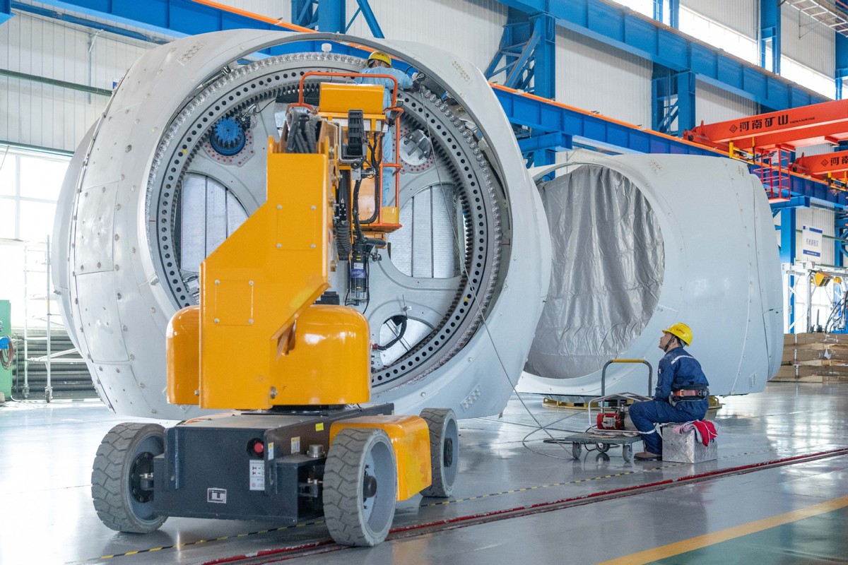 A worker works on wind turbine hubs in the wind power equipment assembly workshop of China First Heavy Industries, in Qiqihar, Heilongjiang province, on April 28, 2024. [Photo/Xinhua]