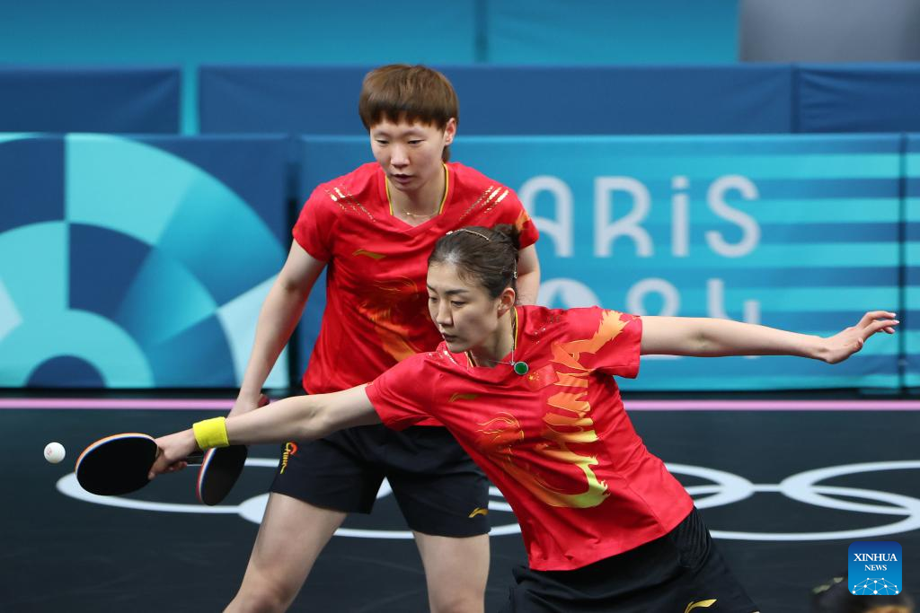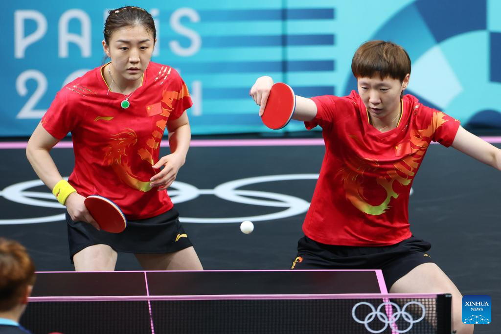 Chen Meng (R)/Wang Manyu of China compete against Chen Szu-Yu/Chien Tung-Chuan of Chinese Taipei during the women's team quarterfinal of table tennis between China and Chinese Taipei at the Paris 2024 Olympic Games in Paris, France, on Aug. 7, 2024. (Xinhua/Liu Xu)