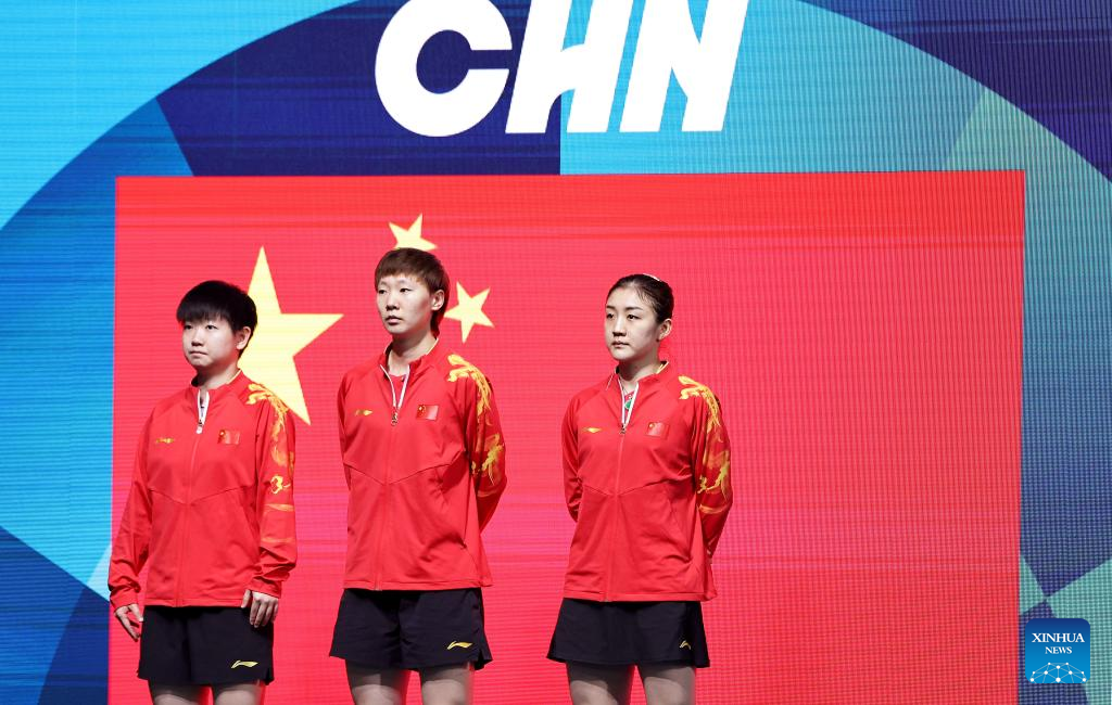 Sun Yingsha (L), Wang Manyu (C) and Chen Meng of China are seen prior to the women's team quarterfinal of table tennis between China and Chinese Taipei at the Paris 2024 Olympic Games in Paris, France, on Aug. 7, 2024. (Xinhua/Wang Dongzhen)