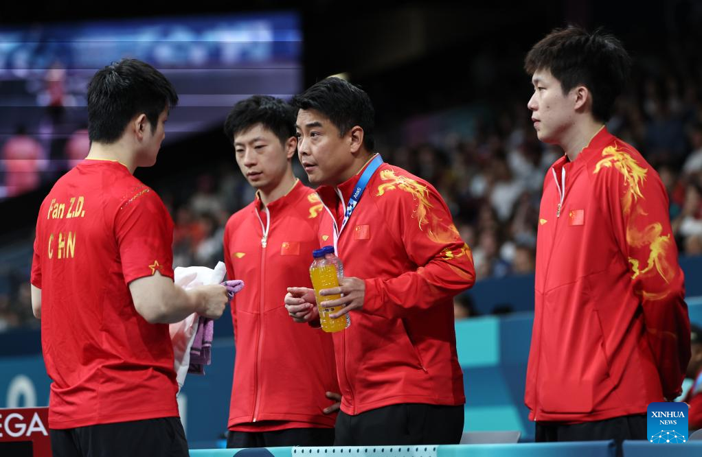 Coach Wang Hao (2nd R) instructs Fan Zhendong (1st L) of china during the men's team quarterfinal of table tennis between China and South Korea at the Paris 2024 Olympic Games in Paris, France, on Aug. 7, 2024. (Xinhua/Wang Dongzhen)