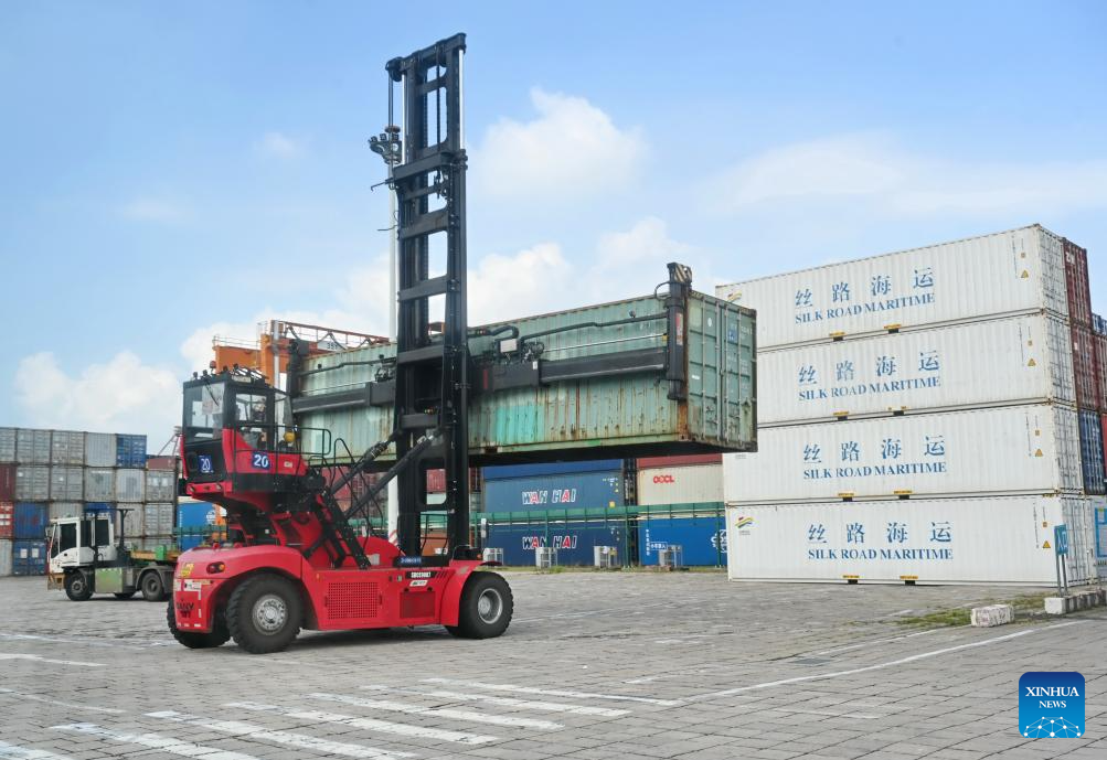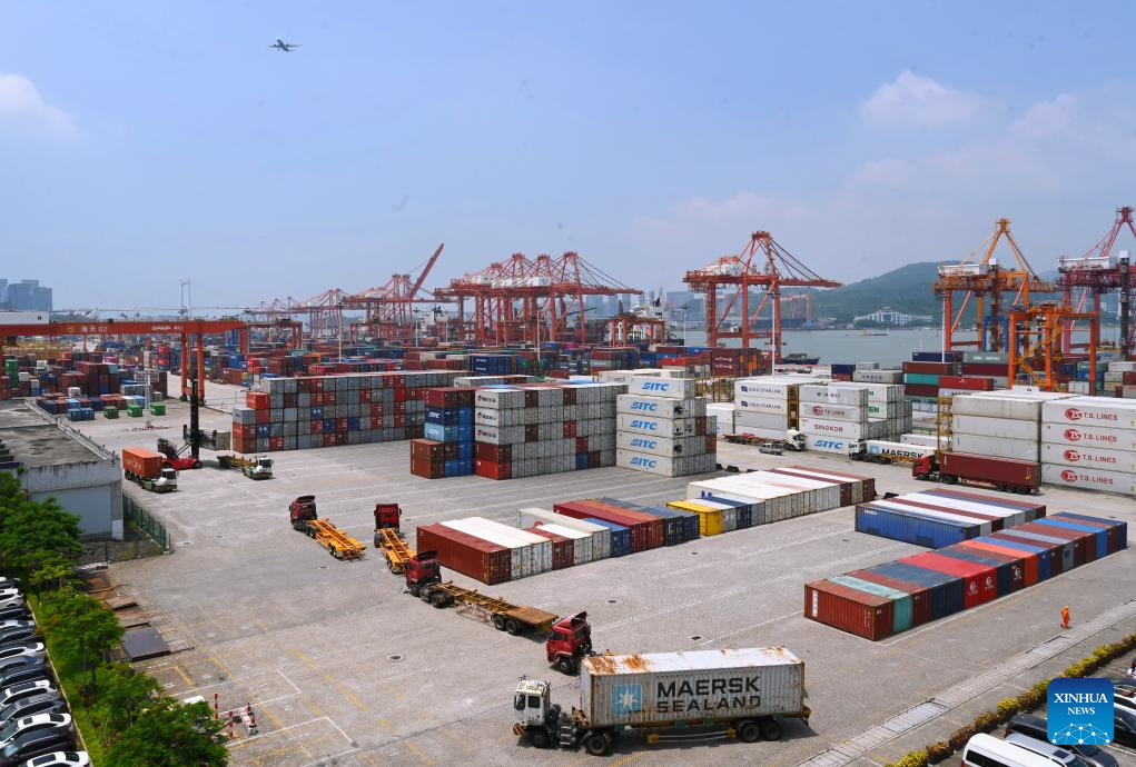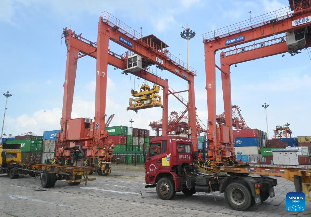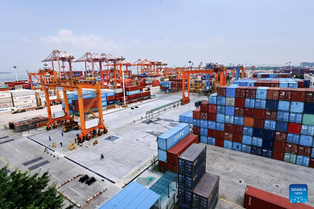 This photo taken on Aug. 6, 2024 shows a view of the Haitian Terminal of Xiamen Port in Xiamen, southeast China's Fujian Province. Xiamen Port has made its fully intelligent transformation in recent years. The container throughput of the port reached 12.55 million twenty-foot equivalent unit (TEU) in 2023. (Xinhua/Lin Shanchuan)