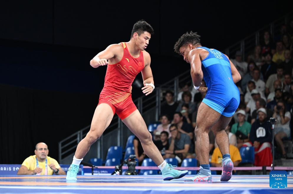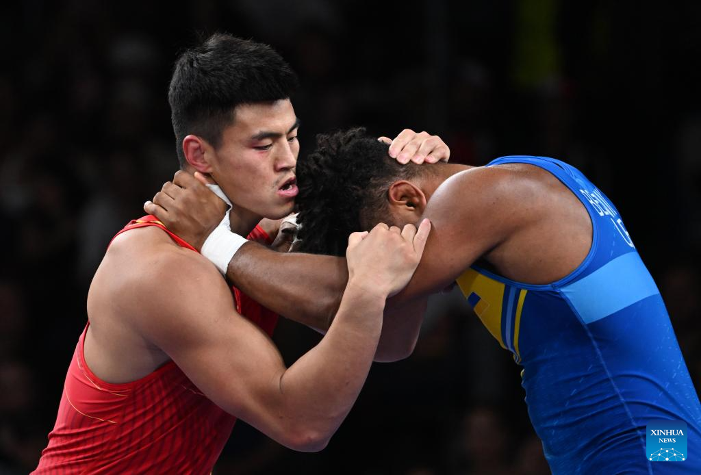 Qian Haitao (in red) of China competes against Zhan Beleniuk of Ukraine during the men's greco-roman 87kg 1/8 final of wrestling at the Paris 2024 Olympic Games in Paris, France, Aug. 7, 2024. (Xinhua/Wu Wei)