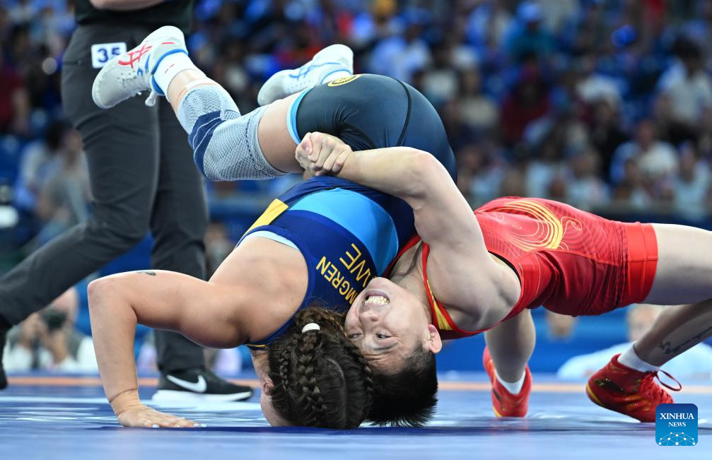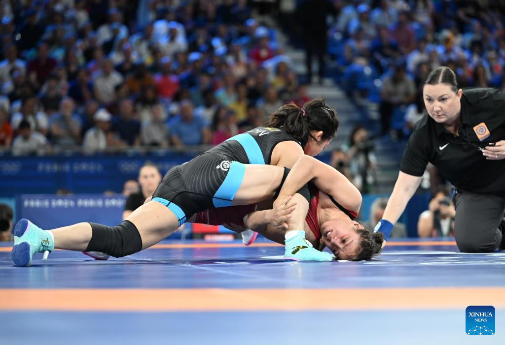 Feng Ziqi (in blue) competes against Ibtissem Doudou of Algeria during the women's freestyle 50kg repechage of wrestling at the Paris 2024 Olympic Games in Paris, France, Aug. 7, 2024. (Xinhua/Wu Wei)