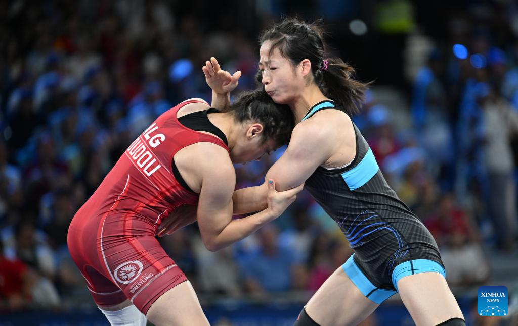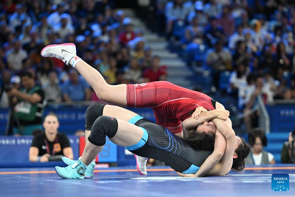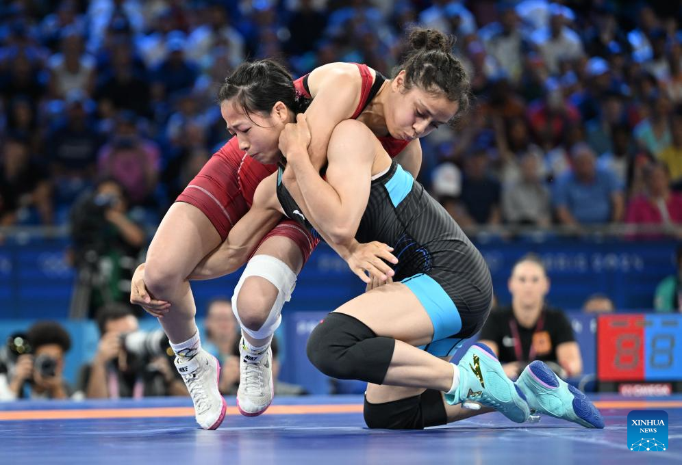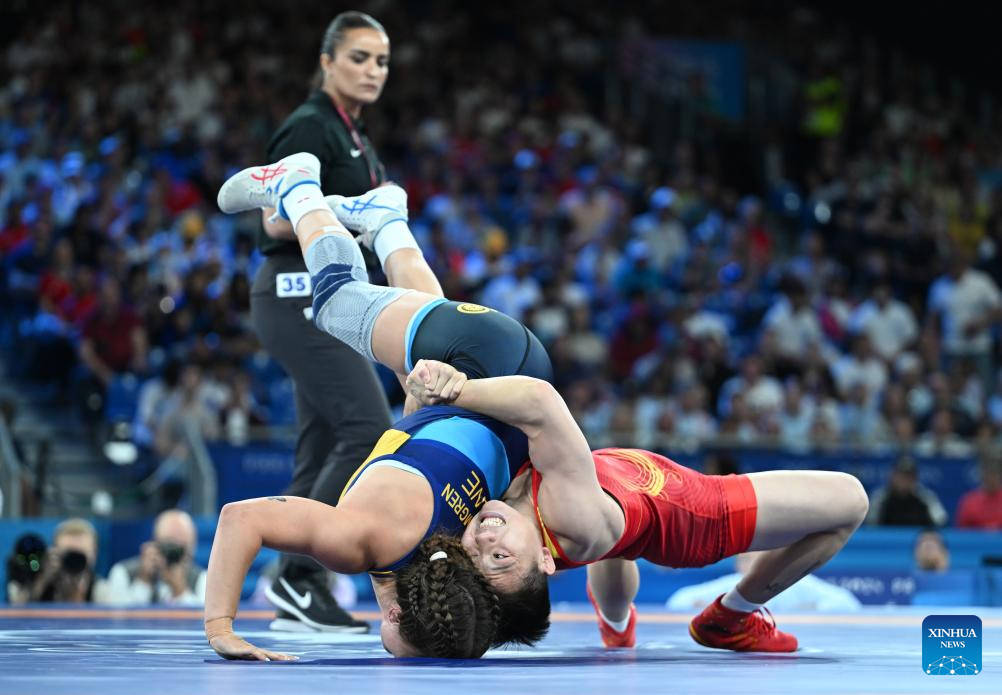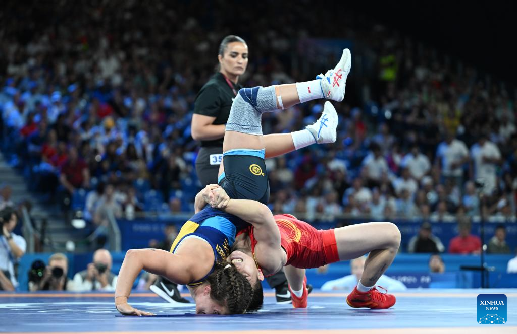 Pang Qianyu (in red) of China competes against Emma Jonna Malmgren of Sweden during the women's freestyle 53kg 1/4 final of wrestling at the Paris 2024 Olympic Games in Paris, France, Aug. 7, 2024. (Xinhua/Wu Wei)
