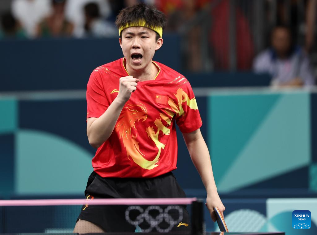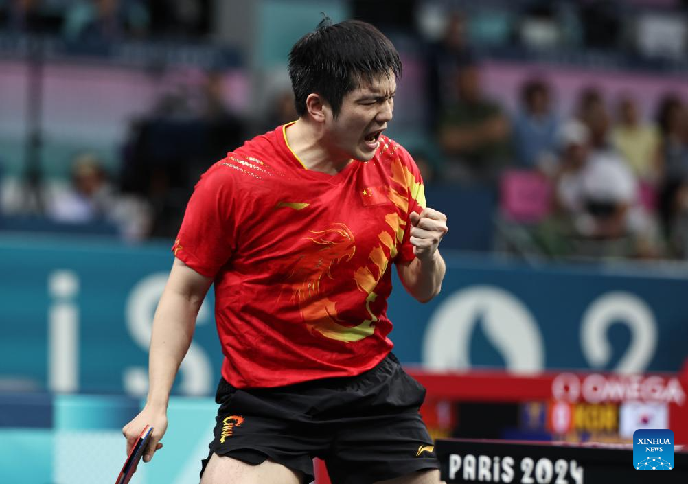 Wang Chunqin of China reacts while competing against Jang Woojin of South Korea during the men's team quarterfinal of table tennis between China and South Korea at the Paris 2024 Olympic Games in Paris, France, on Aug. 7, 2024. (Xinhua/Liu Xu)