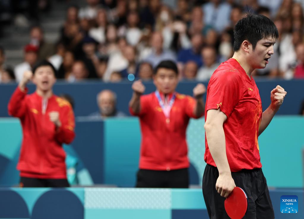Coach Wang Hao (C), players Ma Long (L) and Fan Zhendong of China react during the men's team quarterfinal of table tennis between China and South Korea at the Paris 2024 Olympic Games in Paris, France, on Aug. 7, 2024. (Xinhua/Liu Xu)
