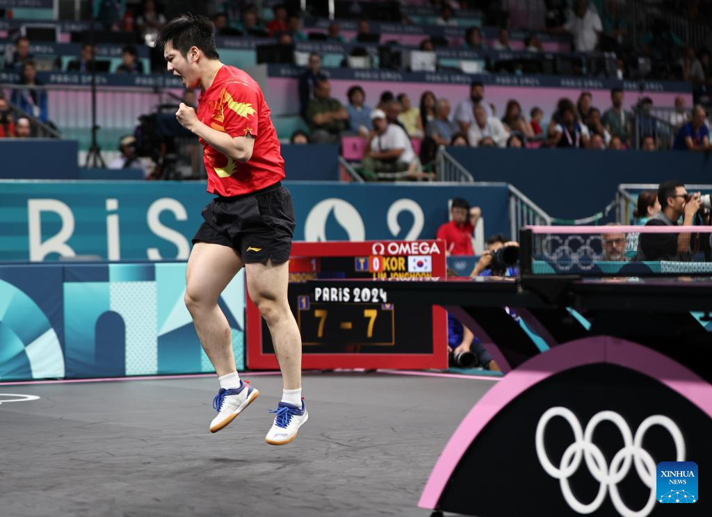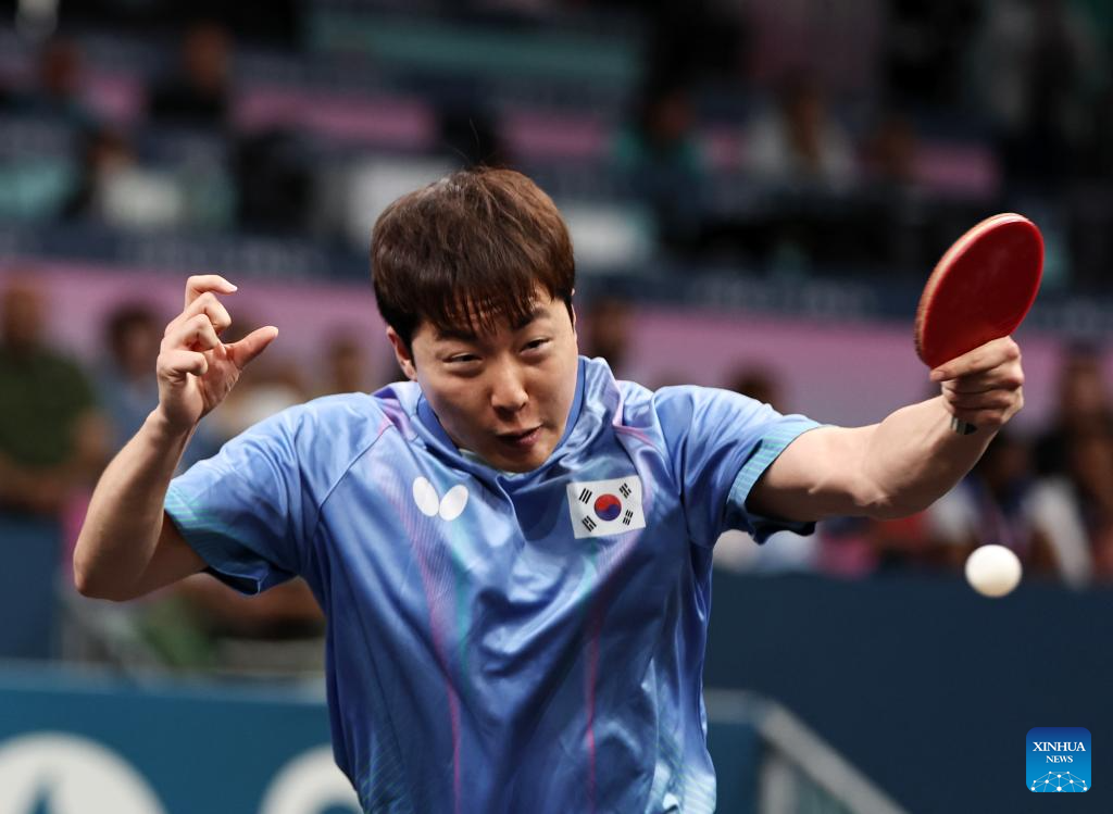 Lim Jonghoon of South Korea competes against Fan Zhendong of China during the men's team quarterfinal of table tennis between China and South Korea at the Paris 2024 Olympic Games in Paris, France, on Aug. 7, 2024. (Xinhua/Wang Dongzhen)