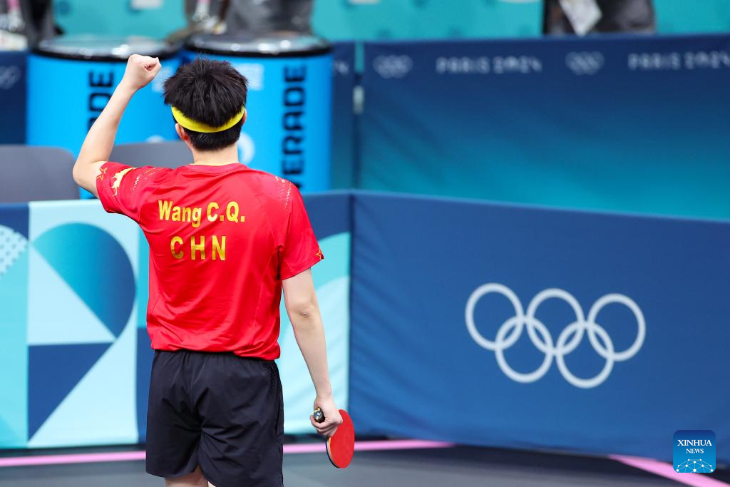Wang Chunqin of China reacts while competing against Jang Woojin of South Korea during the men's team quarterfinal of table tennis between China and South Korea at the Paris 2024 Olympic Games in Paris, France, on Aug. 7, 2024. (Xinhua/Wang Dongzhen)