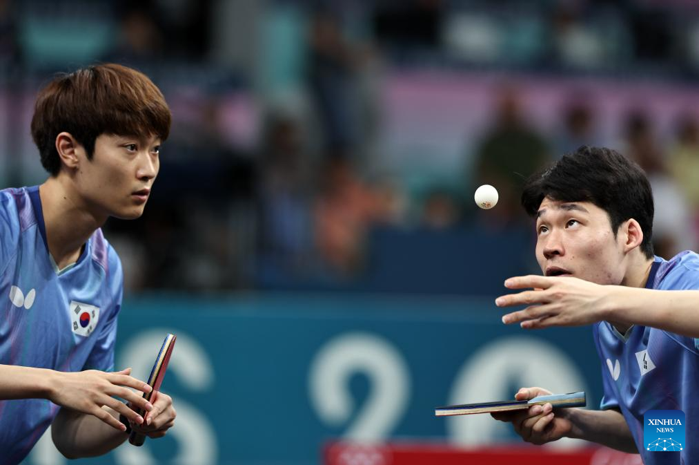 Cho Daeseong (L)/Jang Woojin of South Korea compete against Ma Long/Wang Chuqin of China during the men's team quarterfinal of table tennis between China and South Korea at the Paris 2024 Olympic Games in Paris, France, on Aug. 7, 2024. (Xinhua/Wang Dongzhen)