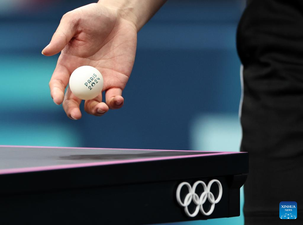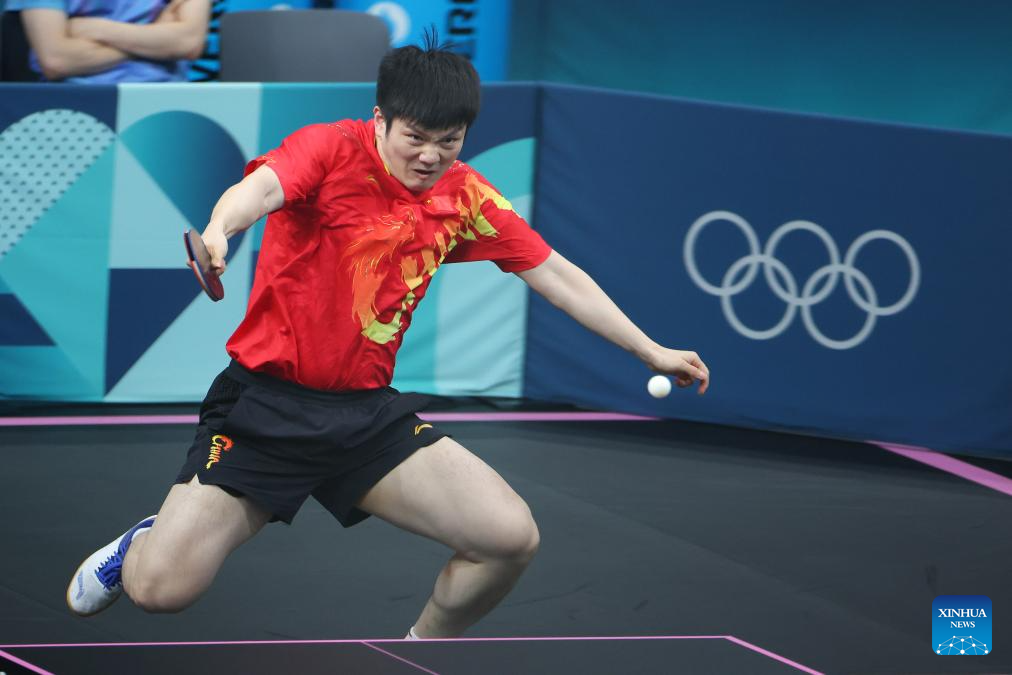 Fan Zhendong of China competes against Lim Jonghoon of South Korea during the men's team quarterfinal of table tennis between China and South Korea at the Paris 2024 Olympic Games in Paris, France, on Aug. 7, 2024. (Xinhua/Liu Xu)