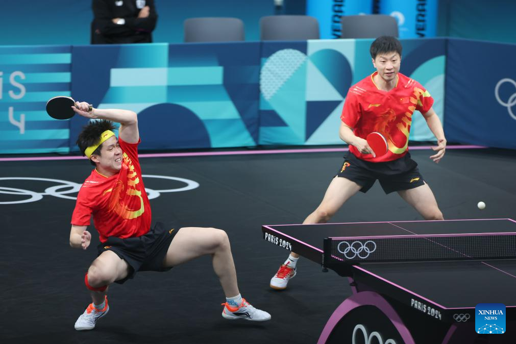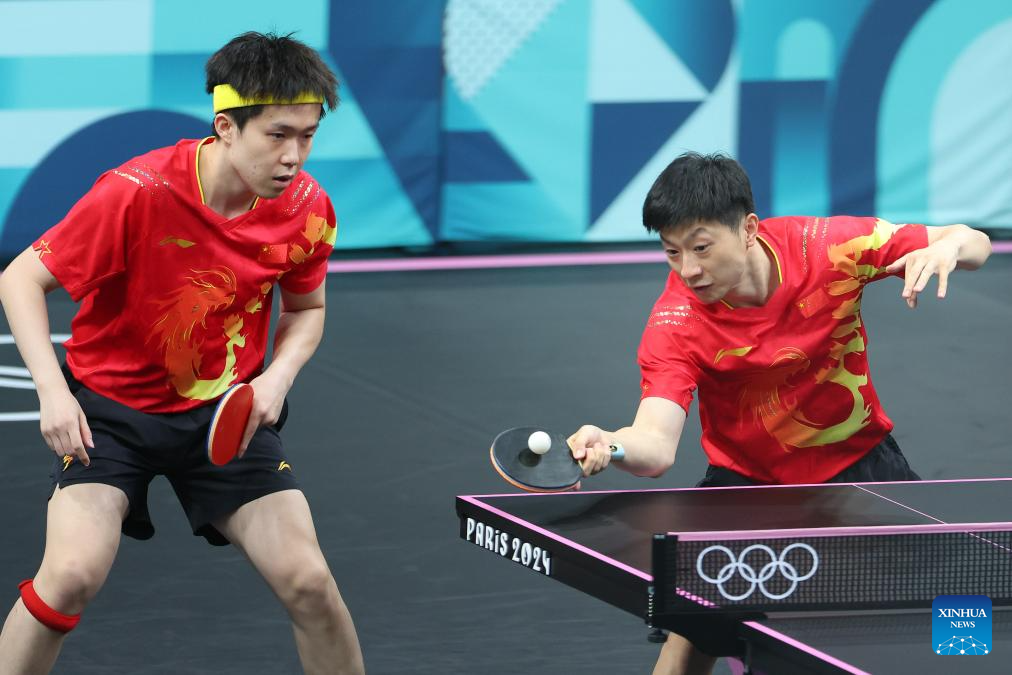 Ma Long (R)/Wang Chuqin of China compete against Cho Daeseong/Jang Woojin of South Korea during the men's team quarterfinal of table tennis between China and South Korea at the Paris 2024 Olympic Games in Paris, France, on Aug. 7, 2024. (Xinhua/Liu Xu)