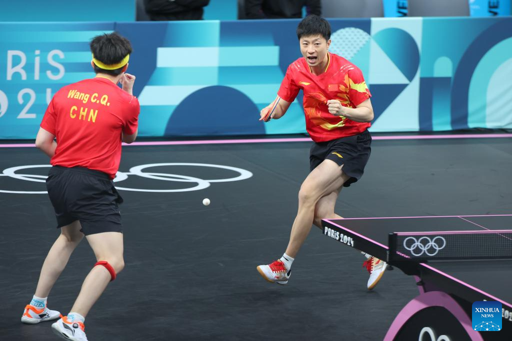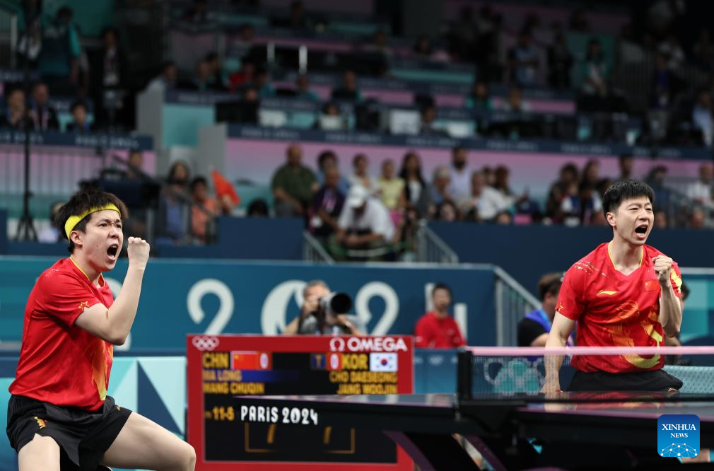 Ma Long (R)/Wang Chuqin of China react while competing against Cho Daeseong/Jang Woojin of South Korea during the men's team quarterfinal of table tennis between China and South Korea at the Paris 2024 Olympic Games in Paris, France, on Aug. 7, 2024. (Xinhua/Liu Xu)