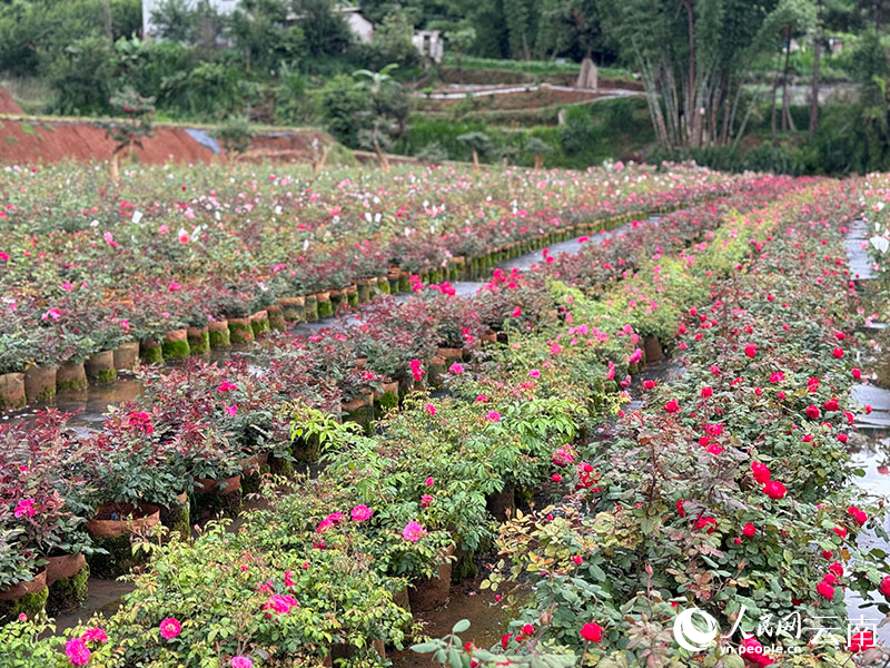 Photo shows the base of Rosa chinensis, commonly known as the Chinese rose, established by Li Shubin and his team in Yongde county, Lincang city, southwest China’s Yunnan Province. (People’s Daily Online/Cai Shujing)