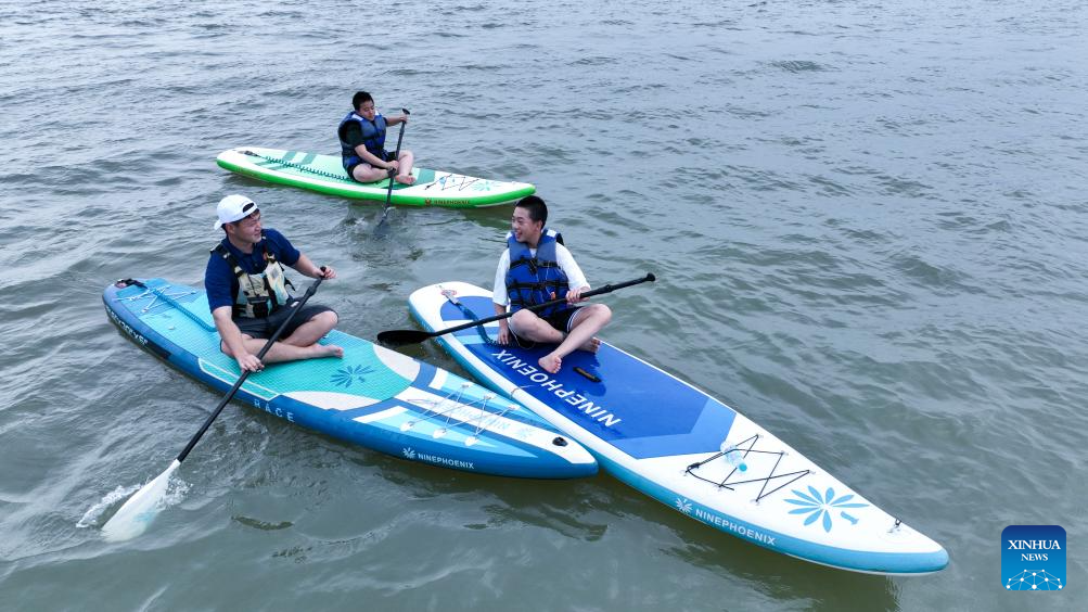 A drone photo taken on April 27, 2024 shows young people talking with each other while experiencing paddleboarding in Jingxi Town of Fuzhou City, southeast China's Fujian Province. (Xinhua/Zhou Yi)