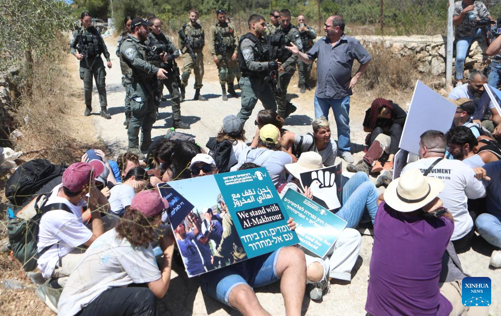 Palestinians and foreign activists confront Israeli soldiers during a demonstration against the Israeli confiscation of land in Beit Jala, near the West Bank city of Bethlehem, on Aug. 8, 2024. (Photo by Mamoun Wazwaz/Xinhua)