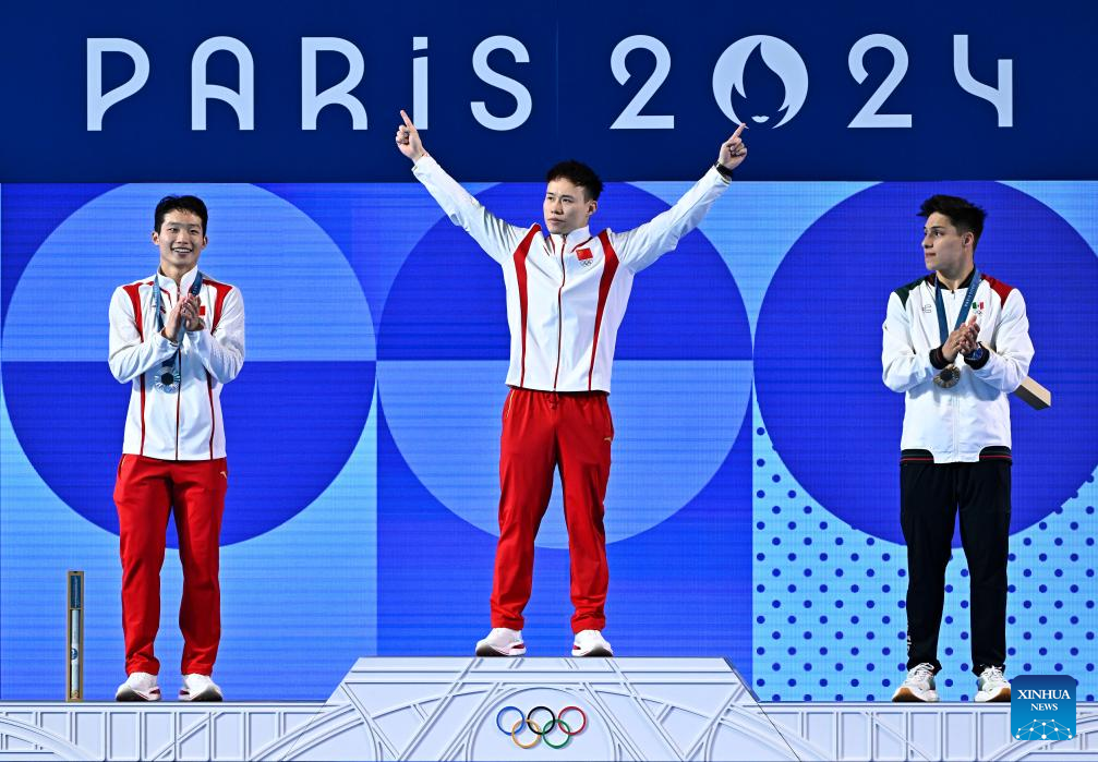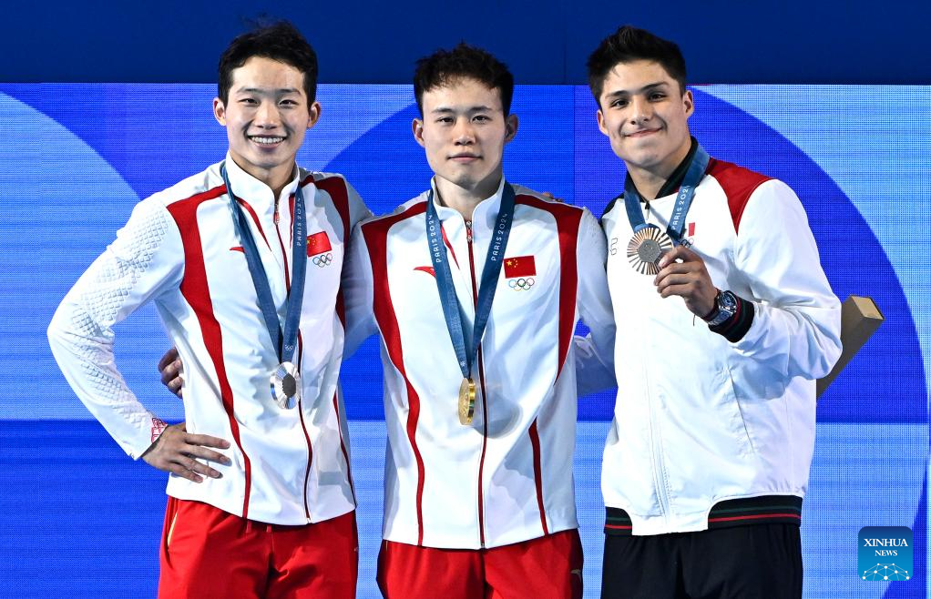 Gold medalist Xie Siyi (C) of China, silver medalist Wang Zongyuan (L) of China and bronze medalist Osmar Olvera Ibarra of Mexico attend the awarding ceremony after the men's 3m springboard final of diving at the Paris 2024 Olympic Games in Saint-Denis, France, Aug. 8, 2024. (Xinhua/Wang Peng)