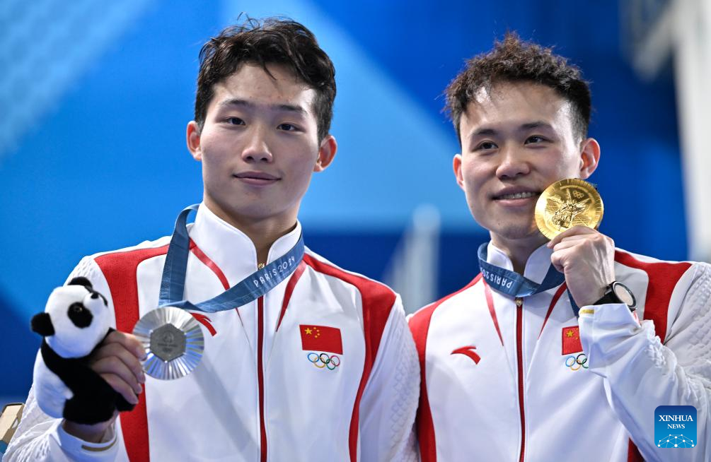 Gold medalist Xie Siyi (R) of China and silver medalist Wang Zongyuan of China pose for photos during the awarding ceremony after the men's 3m springboard final of diving at the Paris 2024 Olympic Games in Saint-Denis, France, Aug. 8, 2024. (Xinhua/Wang Peng)