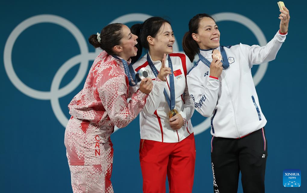 Gold medalist Luo Shifang (C) of China, silver medalist Maude Charron (L) of Canada and bronze medalist Kuo Hsing-Chun of Chinese Taipei take selfies during the awarding ceremony after the weightlifting women's 59kg competition at the Paris 2024 Olympic Games in Paris, France, on Aug. 8, 2024. (Xinhua/Yang Lei)