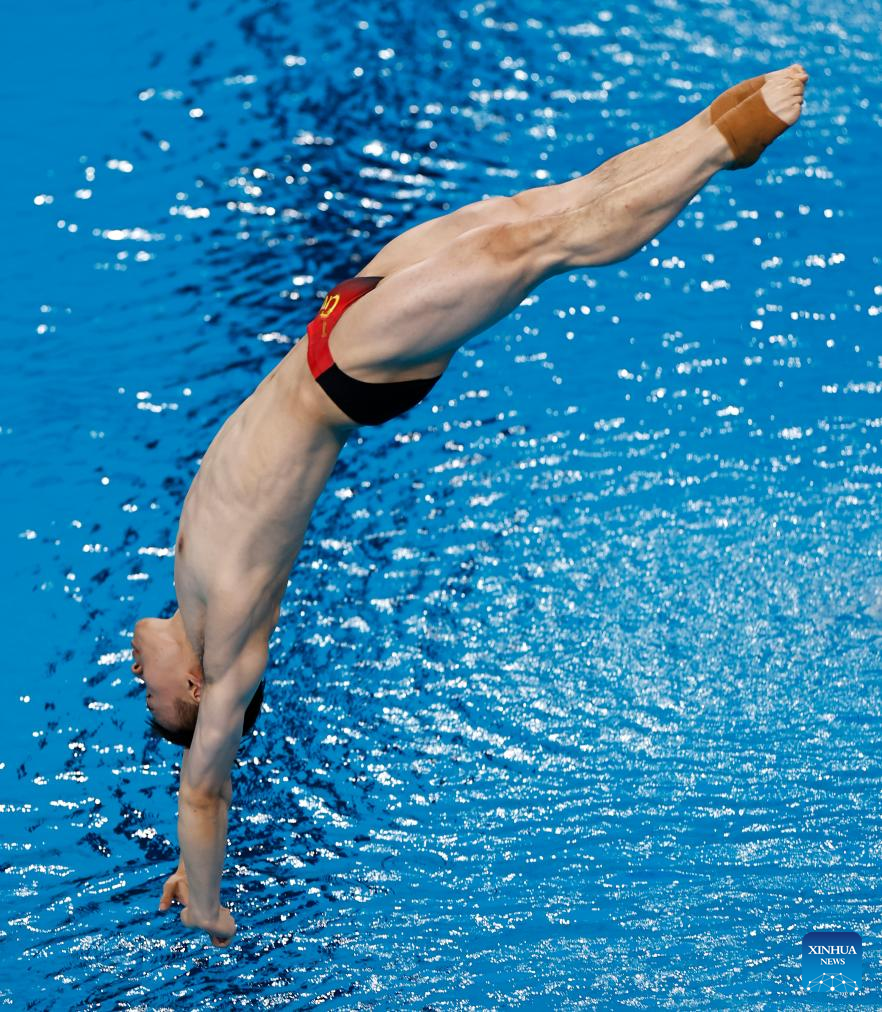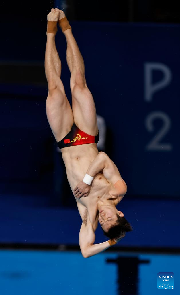Xie Siyi of China competes during the men's 3m springboard final of diving at the Paris 2024 Olympic Games in Saint-Denis, France, Aug. 8, 2024. (Xinhua/Zhang Yuwei)