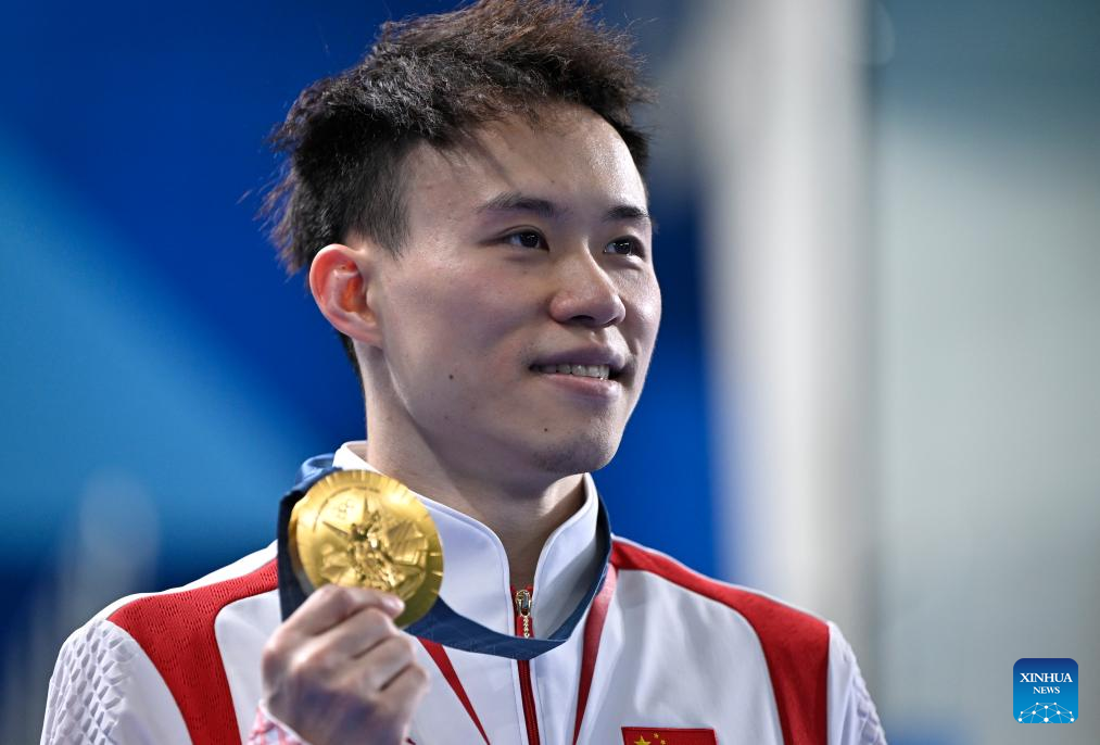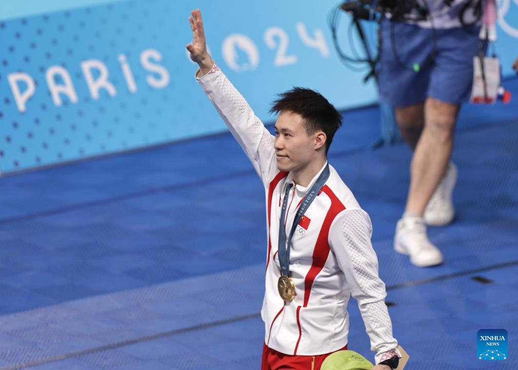 Gold medalist Xie Siyi of China attends the awarding ceremony after the men's 3m springboard final of diving at the Paris 2024 Olympic Games in Saint-Denis, France, Aug. 8, 2024. (Xinhua/Wang Peng)