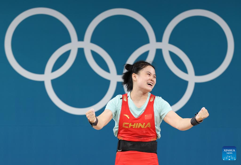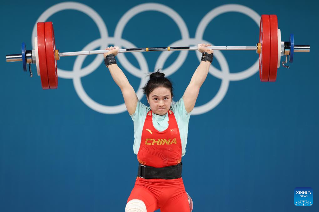 Luo Shifang of China competes during the weightlifting women's 59kg competition at the Paris 2024 Olympic Games in Paris, France, on Aug. 8, 2024. (Xinhua/Yang Lei)