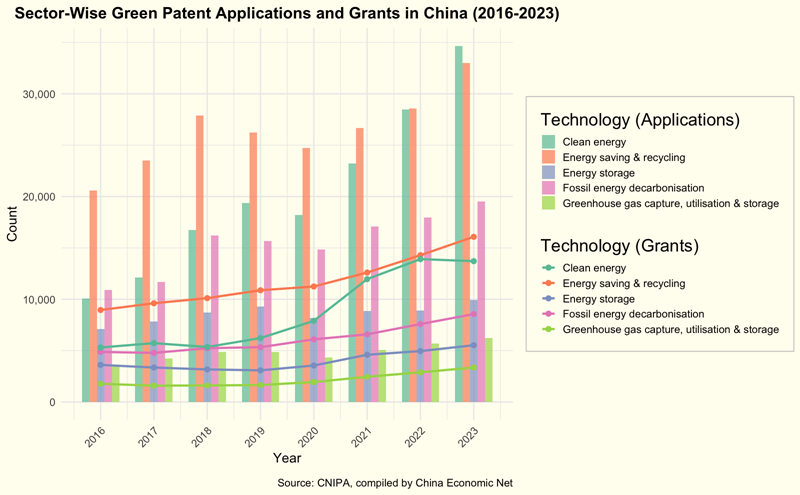 Green patent grants shared a similar trend in China over the same period. From 2016 to 2023, energy saving and recycling grants reached 94,000, 35.8% of the 248,000 total grants, followed by energy storage, clean energy, fossil fuel decarbonisation, and greenhouse gas capture, utilisation and storage. Specifically, energy storage grants experienced the biggest growth with an average annual rate of 15.9%.