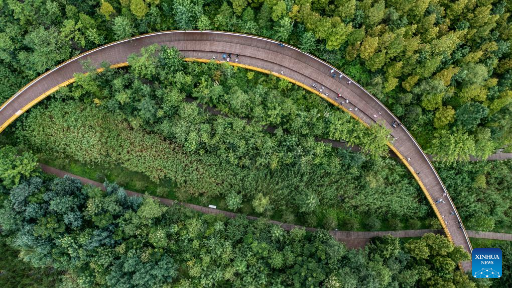 An aerial drone photo taken on Aug. 7, 2024 shows tourists visiting Minghu Lake National Wetland Park in Zhongshan District of Liupanshui, southwest China's Guizhou Province. The wetland park, located in Zhongshan District of Liupanshui, is rich in vegetation. (Xinhua/Tao Liang)